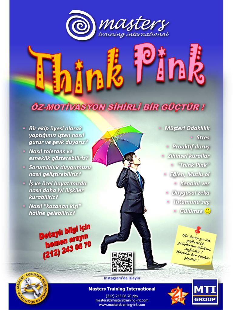 Kurum çalışanlarının kendileriyle barışık olmaları iç motivasyonlarının yükselmesi, birlikte çalışmaktan ve "yaşamaktan" keyif almaları başarma istekliliklerini ve performanslarını arttırdığı gibi işe ve içinde bulunduğu kuruma olan bağlılıklarına da önemli artış getirmekte. Think Pink bu konuda sihirli bir dokunuşla eşsiz bir katkı sağlar!